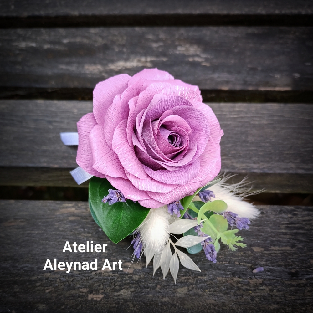 Cocarda cu trandafir realizat manual din hartie floristica si verdeata artificiala.