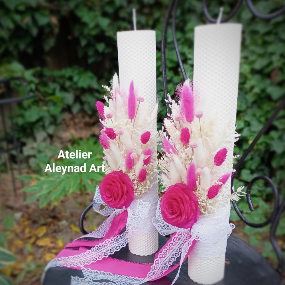 Lumanari de nunta tip fagure cu trandafiri fucsia lucrati manual, petala cu petala din hartie floristica si flori naturale uscate/criogenate.