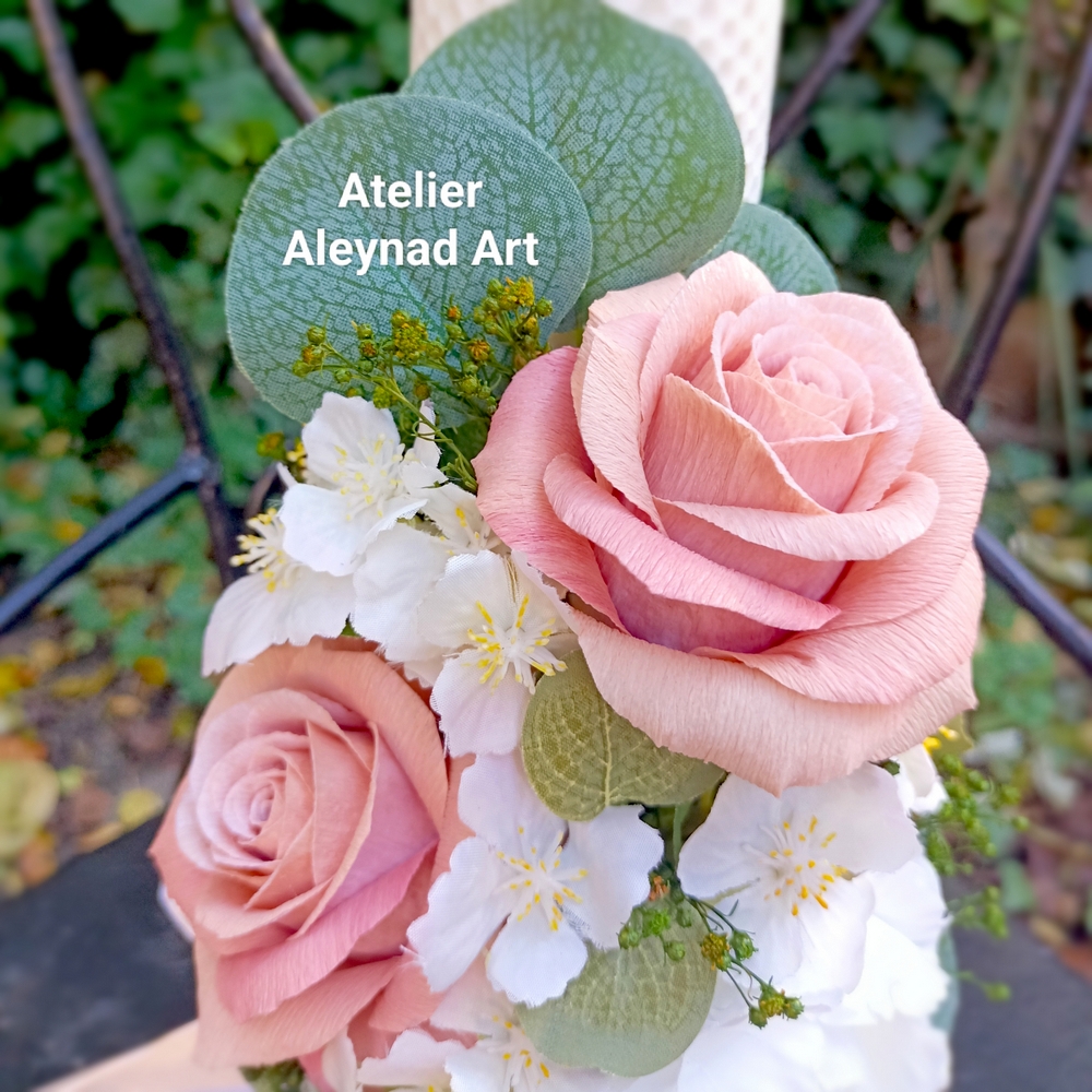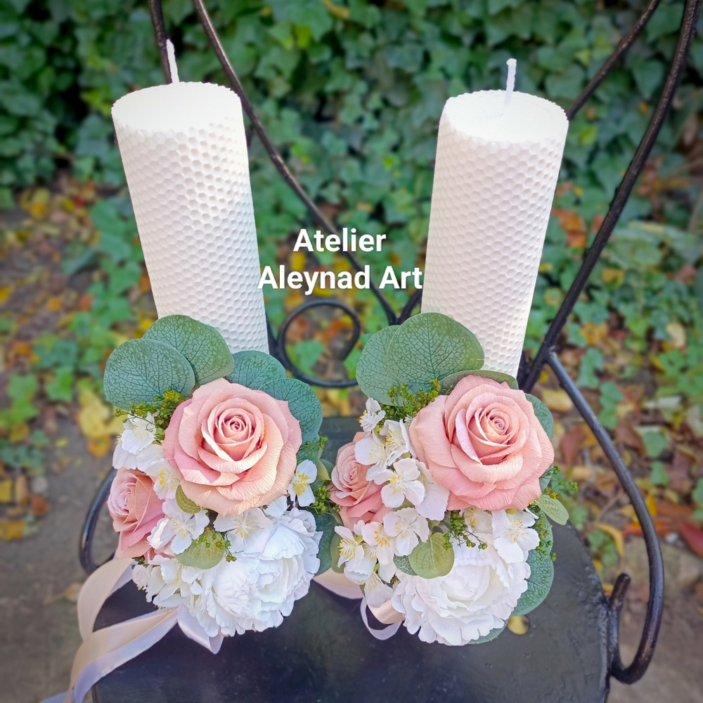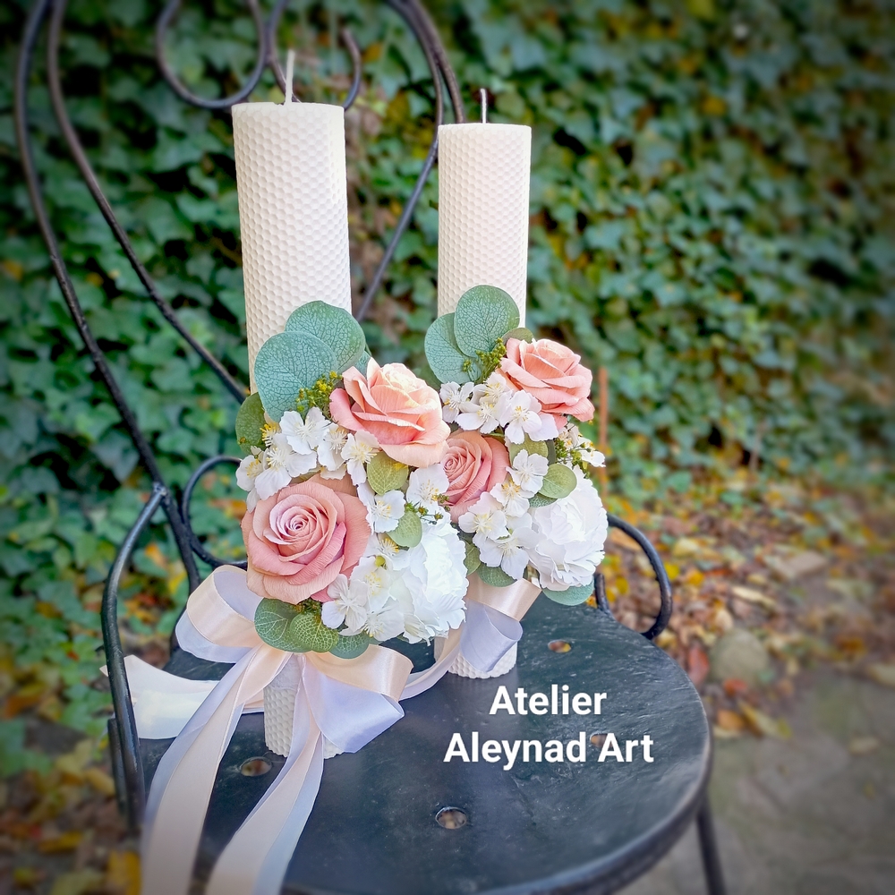 Lumanari de nunta tip fagure de ceara cu trandafiri peach lucrati manual, petala cu petala din hartie floristica pictata, bujori albi din matase si verdeata artificiala.