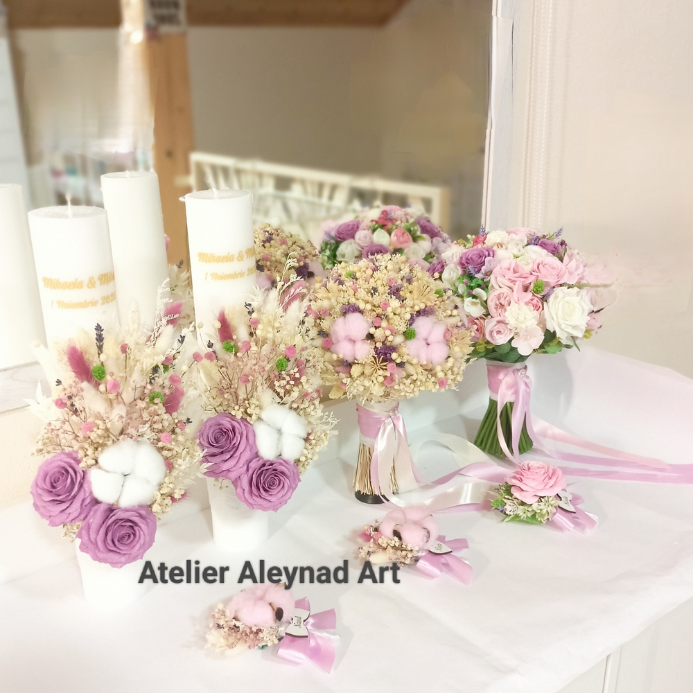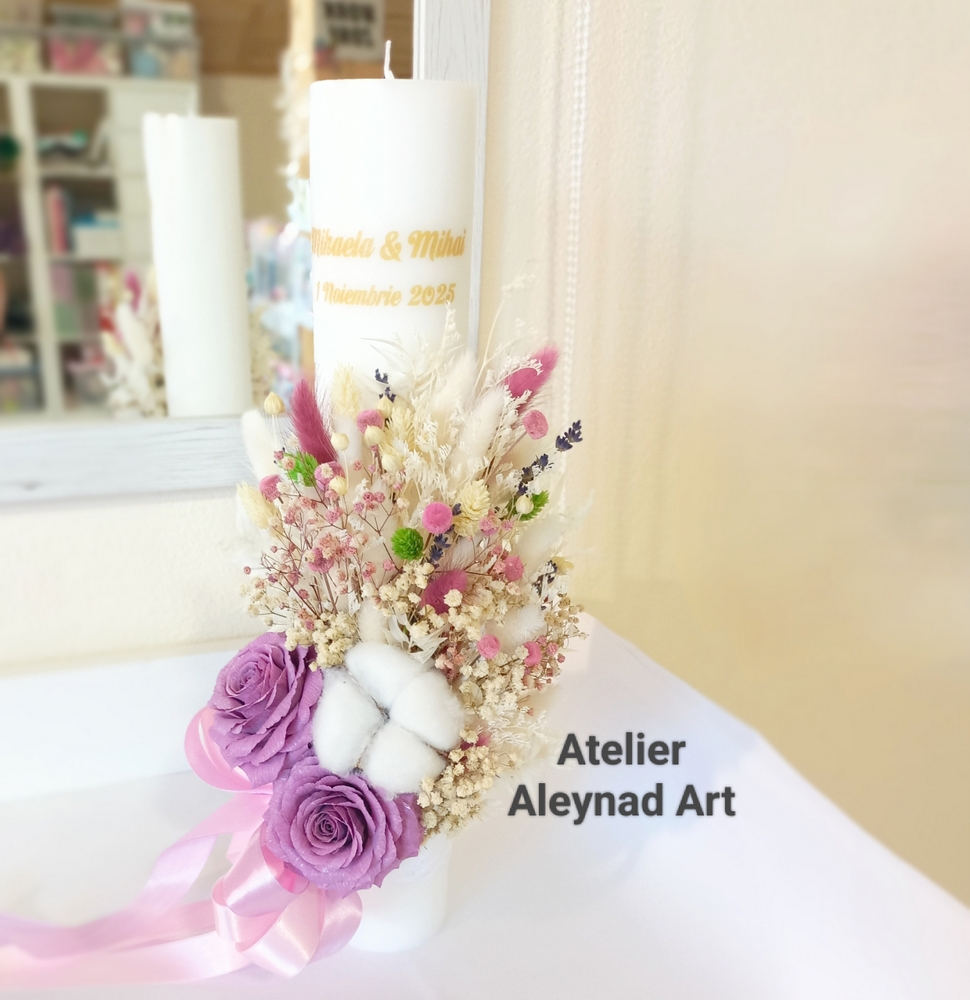Lumanari de nunta tip fagure cu trandafiri mov lucrati manual, petala cu petala din hartie floristica si flori naturale uscate/criogenate.